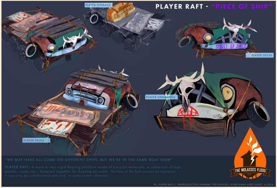 "WE MAY HAVE ALL COME ON DIFFERENT SHIPS, BUT WE'RE IN THE SAME BOAT NOW" PLAYER RAFT; A MORE OR LESS RIGID FLOATING PLATFORM MADE OF BUOYANT MATERIALS: A COLLECTION OF LOGS, PLANKS, CASKS, ETC., FASTENED TOGETHER FOR FLOATING ON WATER. THE FATE OF THE ROFT CANNOT BE MASTERED; IT CAN ONLY BE COLLABORATED WITH AND, TO SOME EXTENT, DIRECTED.